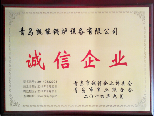 青島凱能鍋爐榮獲2014年度“青島市誠信企業”榮譽稱號